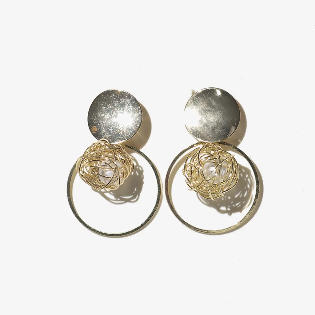 Korean Geometric Hollow Thread Ball Pearl Pendant Earrings